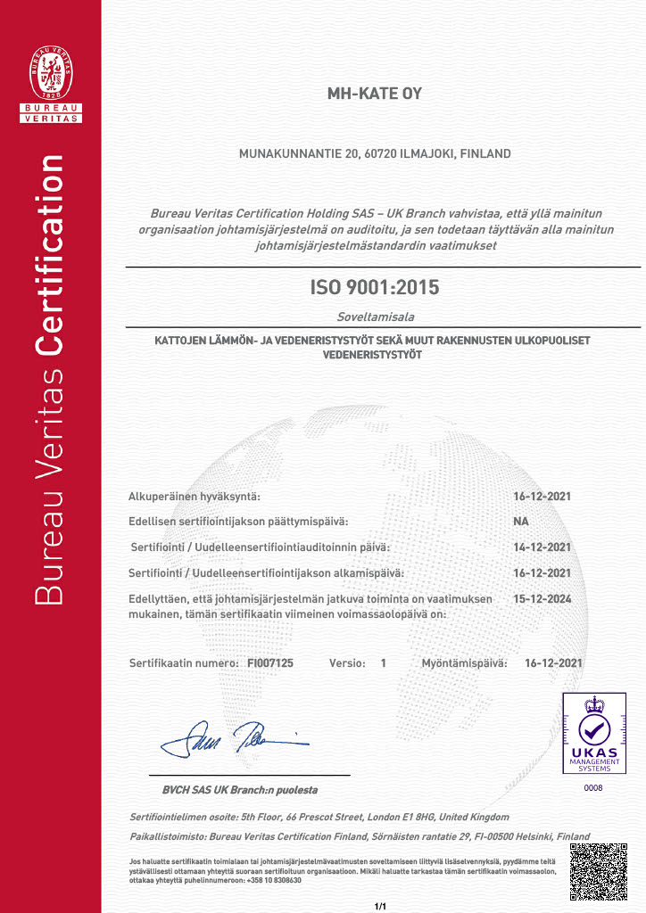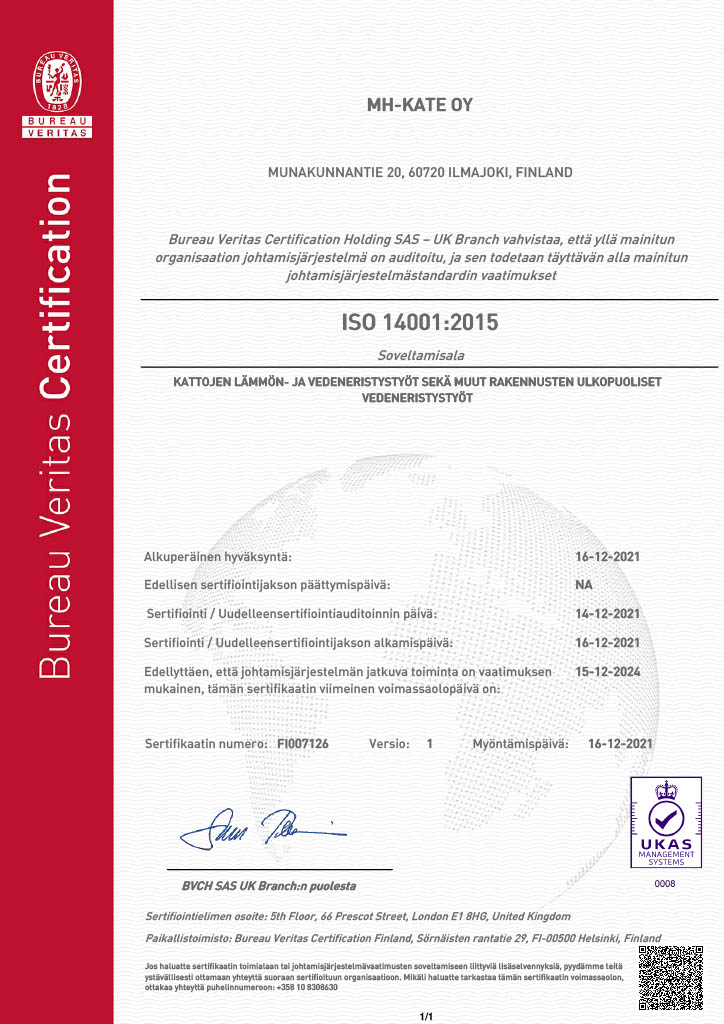 Bureau Veritas myönsi yrityksellemme alan ensimmäisten joukossa ISO9001 ja ISO14001 sertifikaatit osoituksena ammattimaisesta ja laadukkaasta sekä ympäristön huomioivasta liiketoiminnan harjoittamisesta. Olemme iloisia tästä ulkopuolisen tahon tekemästä arvioinnista, se on suuri arvostus yrityksemme tekemästä jokapäiväisestä työstä. Jatkuvan parantamisen ja kehittämisen työtä on tästä hyvä jatkaa, onhan asiakastyytyväisyys toimintamme kulmakivi.